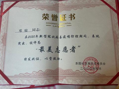 学子以实际行动展现了新时代青年大学生的责任与担当,赢得了广泛的社会好评。5月15日,物理与光电工程学院2016级凝聚态物理博士研究生邓姣因在疫情防控期间表现突出,被怀化市鹤城区茶园社区党总支委员会评为“最美志愿者”。在河南省西峡县双龙镇召开的防疫工作总结大会上,a漫