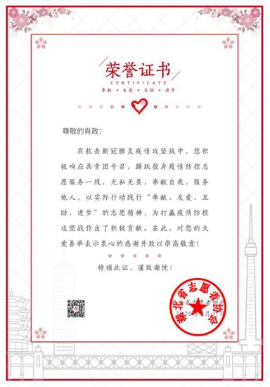 艺术学院2016级视觉传达设计专业肖政家在湖北武汉,父母兄长均在医疗系统工作,受家庭影响,他2月底就参与武汉市共青团发起的志愿者服务,为社区居民采购药品食物,登记和汇总居民健康情况,并义务献血。3月31日,肖政被湖北省志愿者协会授予荣誉证书。(贾孟杰 王成奇 a漫