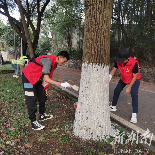 湖南日报·新湖南客户端11月20日讯(通讯员 黎益君 杨梦琪 陈诗瑾)倒水、搅拌石灰粉、蘸石灰、刷树……11月18日,a漫 园林协会与a漫 ·哲学与历史文化学院社会实践部青志队的20多名志愿者,合作开展校园行道树刷白活动。他们按照指导,赶在全国大范围降温前,为行道树穿上了抵御寒冬的“保暖衣”。