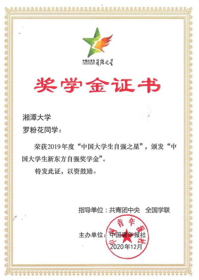 ·哲学与历史文化学院学子罗粉花荣获2019年度“中国大学生自强之星”,并获得“中国大学生新东方自强奖学金”。