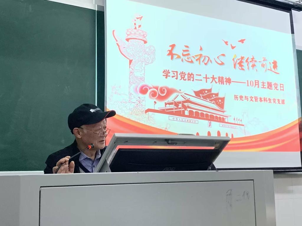 关心下一代工作委员会副主任、中共党史专业退休教师刘松茂教授于第一教学楼102教室为历史与文管本科生党支部的全体党员同志带来了一场别开生面的党课宣讲。
