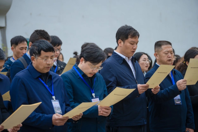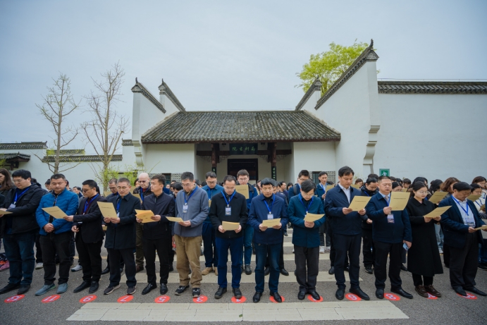 在南轩文化园飨堂前坪,全体人员整齐肃立,行三鞠躬礼,深切表达对张浚、张栻两位先贤的崇高敬意和缅怀之情。在主持人的领诵下,大家齐诵《中庸》首章与《永州新学门铭》。