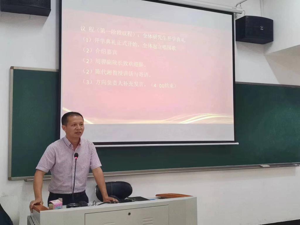 陈代湘教授寄语2023级哲学研究生。他对新生提出四点希望:第一,要过学术人生。陈教授说学术是文化的核心,我们要做好文化传承与创新。文化是全世界的文化,但是我们可以为己所用做中国人的文化,哲学博大精深我们也能把世界的哲学变成中国的哲学。第二,要为民族做学问。陈教授从开学典礼奏唱国歌的角度,引出我们要致力于用哲学凝神聚心振兴中华民族,学哲学不仅仅是自己的学业事业,更要为民族做学问为国家做学术研究。第三,要反省自己的人生。陈代湘教授引用苏格拉底的格言“未经审视的人生是不值得过的”,勉励学生学习哲学更要学会反思。鼓励学生通过阅读一本书实现与古今中外的贤者对话,实现自我反思,不断进步。陈教授认为研究生读书要做到开卷有喜乐,研究生不要把书读苦,而要把读书变快乐。最后,陈代湘教授从工作角度勉励研究生过学术人生,陈教授说学术有益于工作。学术方式也是工作方法:要善于发现问题、培养严谨态度、逻辑严密、行为规范、校对严谨、文字精准的学术习惯。