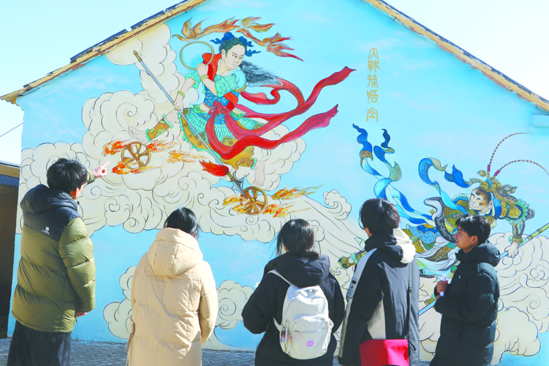 2月7日,游客在安徽省蚌埠市固镇县九湾哪吒闹海展览馆参观哪吒闹海墙画。中新社记者 赵强 摄
