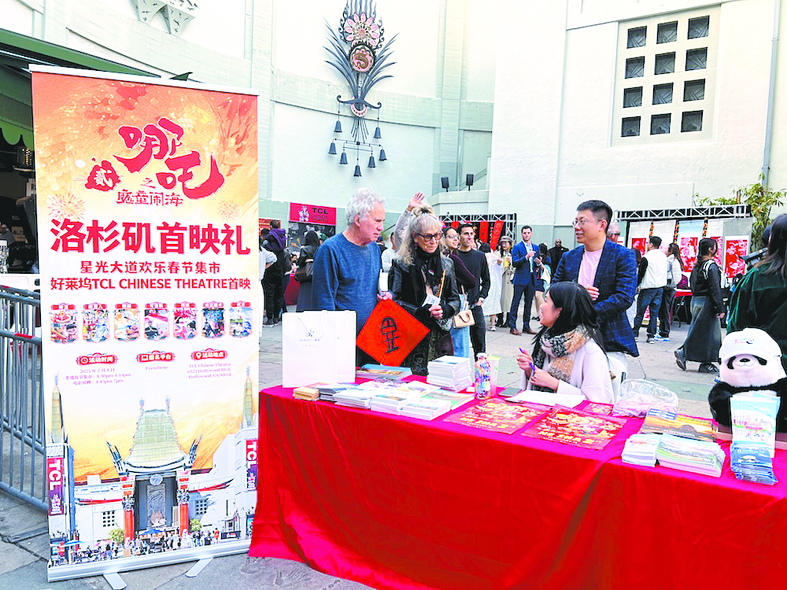 当地时间2月8日,《哪吒之魔童闹海》洛杉矶首映礼在美国好莱坞中国剧院举行。图为首映礼及同时举办的“欢乐春节集市”现场。中新社记者 张朔 摄