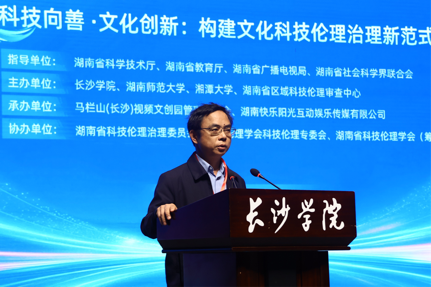 、湖南省区域科技伦理审查中心联合主办,马栏山(长沙)视频文创园管理委员会、湖南快乐阳光互动娱乐传媒有限公司承办,湖南省科技伦理治理委员会、中国伦理学会科技伦理委员会、湖南省科技伦理学会协办,湖南省科学技术厅、湖南省教育厅、湖南省广播电视局、湖南省社会科学联合会提供指导。本次会议分为主会场及三个分会场,与会专家学者围绕文化科技、人工智能与科技伦理教育的治理方法与理论探索,展开了热烈且富有现实意义的交流与讨论。