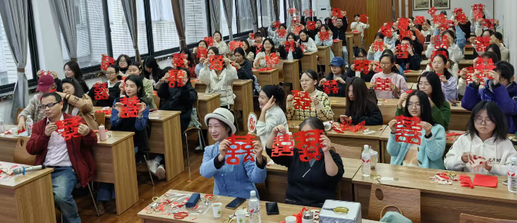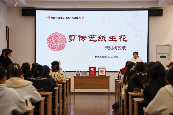 11月23日,传承人冯程程老师带来《剪传艺纸生花——云湖桥剪纸》非遗体验讲堂。她讲述自己与剪纸的半生情缘,阐释“有图必有意,有意必吉祥”的民间哲学,带领大家以剪为笔、以思为墨,在镂空与留白间构筑意象。最后,师生共同举起凝聚心意的剪纸作品,将无声的祝愿定格为永恒的画面。