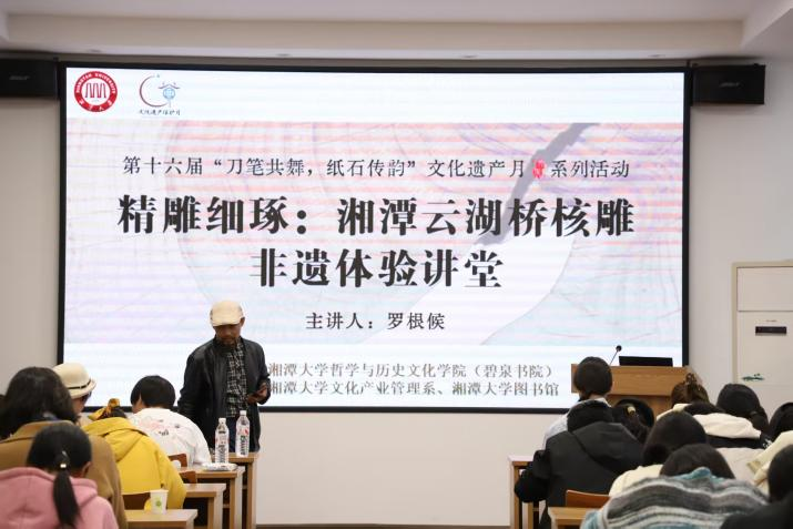 11月22日,传承人罗根候老师带来了《精雕细琢:湘潭云湖桥核雕非遗体验讲堂》。从核雕的悠久历史到写实与写意的核雕手法,从各类雕刻核料到作品的方寸乾坤,传承人将这一非遗技艺娓娓道来。执刀起舞,核间细刻,罗老师引导大家以指尖温度唤醒果核的生命。现场问答交织,思与技在此刻共鸣。