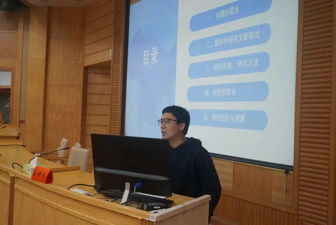 博士后王鹏以自己的博士论文《历史唯物主义视域下哈维空间正义思想研究》为主题,向大家介绍了大卫•哈维的空间正义思想,并从问题的提出、国内外研究文献综述、研究内容与研究方法、研究创新点、研究结论与展望等五个方面向同学们分享了他的写作思路。王鹏老师的分享不仅让同学们受益匪浅,同时还使其他主讲人受到了关于自己学科问题的启发并引发讨论。