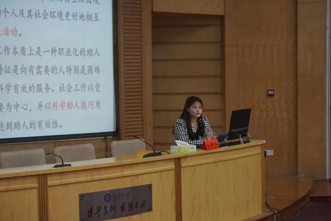 姚智俐同学的主题为“从理论研究到专业实践——在扎根中国大地中了解民情”,她向同学们分享了自己在追求真理中博学笃行、在扎根中国大地中了解民情、在创新创业中增长才干、在讲好湘大故事中读懂中国等亲身实践的经历。姚同学认为实践是认识的基础,要重视在实践中帮助服务对象解决生活、情感方面的难题。在整个分享过程中,同学们认真聆听且表示收获满满。毛小平教授对姚智俐同学积极投身实践的精神表示高度赞赏,并对场下的同学们表达了殷切的期望。