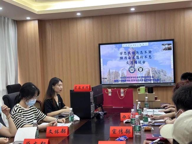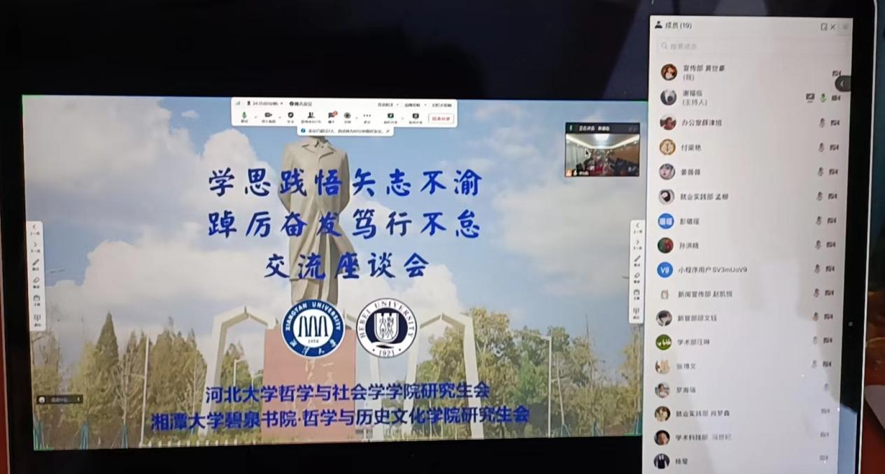 ·哲学与历史文化学院研会联合河北大学哲学与社会学学院研会,两院共同携手,开展此次线上交流座谈会,于会中分享经验、交流工作、共同进步。本次交流会在毛泽东研究中心大楼北318举行。