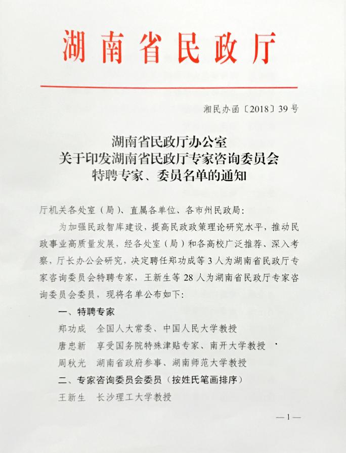 为加强民政智库建设,提高民政政策理论研究水平,推动民政事业高质量发展,决定聘任郑功成?/font>3人为湖南省民政厅专家咨询委员会特聘专家,王新生等28人为湖南省民政厅专家咨询委员会委员,我校碧泉书院·哲学与历史文化学院社会工作硕士学位点负责人杨小军教授聘任为湖南省民政厅专家咨询委员会委员?/font>