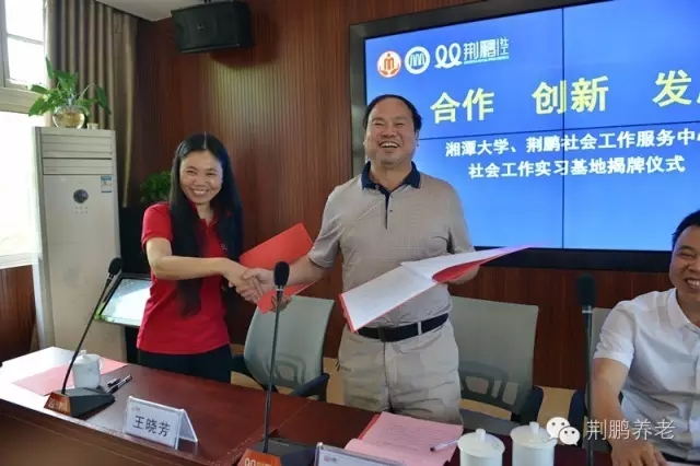 2016??5日上午,湘潭大学、荆鹏社会工作服务中心社会工作实习基地揭牌仪式在湘潭市荆鹏养老服务有限公司举行。湘潭大学哲学系主任王向清教授、湘潭市民政局唐建军副局长、湘潭市荆鹏社会工作服务中心王晓芳理事长出席仪式并讲话,出席仪式的还有市民政局、岳塘区民政局的领导、湘潭大学哲学系社会学教研室教师代表和社会工作专业硕士学位研究生代表?span style="box-sizing: border-box !important; padding-bottom: 0px; line-height: 23px; background-color: rgb(255,255,255); text-indent: 32px; margin: 0px; padding-left: 0px; padding-right: 0px; font-family: 宋体; max-width: 100%; word-wrap: break-word !important; white-space: pre-wrap; font-size: 18px; padding-top: 0px">?/span>